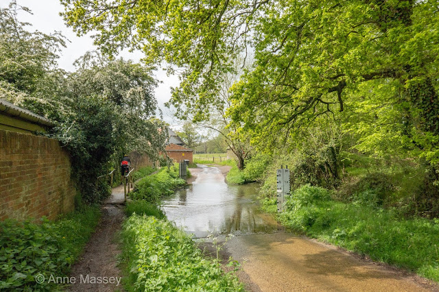 Now all the way into Mortimer, turning into Clappers Farm Road to cross the ford. Ford too deep today, and path a bit slippery, so we slide on one foot!